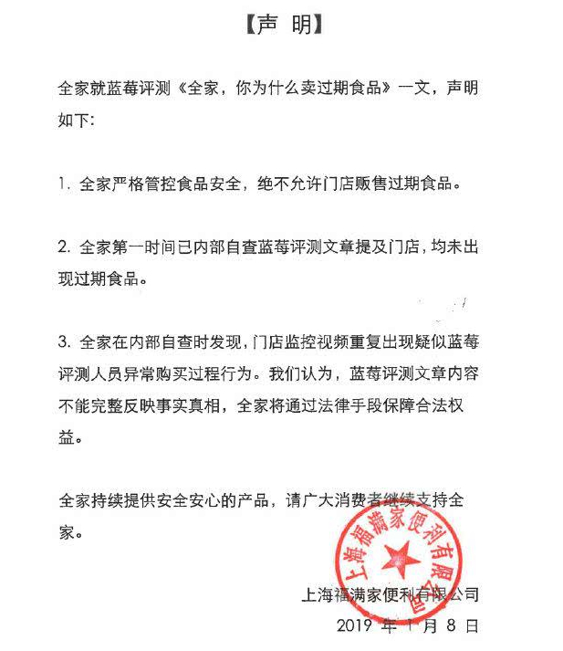 對此,全家發(fā)表聲明稱,首先全家嚴格管控食品安全,絕不允許門店販售過期食品;其次藍莓評測內(nèi)容不能完整反映事實真相,全家將通過法律手段保障合法權(quán)益。