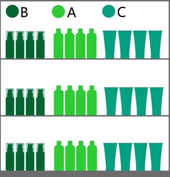 是否需要量感陳列,主要考慮商品的被需求程度、消耗速度和品牌數(shù)量。如: