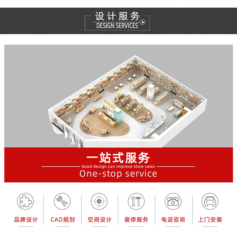 時尚貨架為顧客提供一站式店鋪解決方案,包括:店鋪設(shè)計(便利店,藥店,精品超市,母嬰店,文具店,化妝品店,書城等各類店鋪)、陳列布局、深圳貨架定制、深圳貨架生產(chǎn)、上門安裝等服務(wù)!