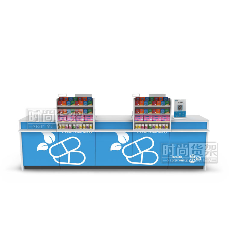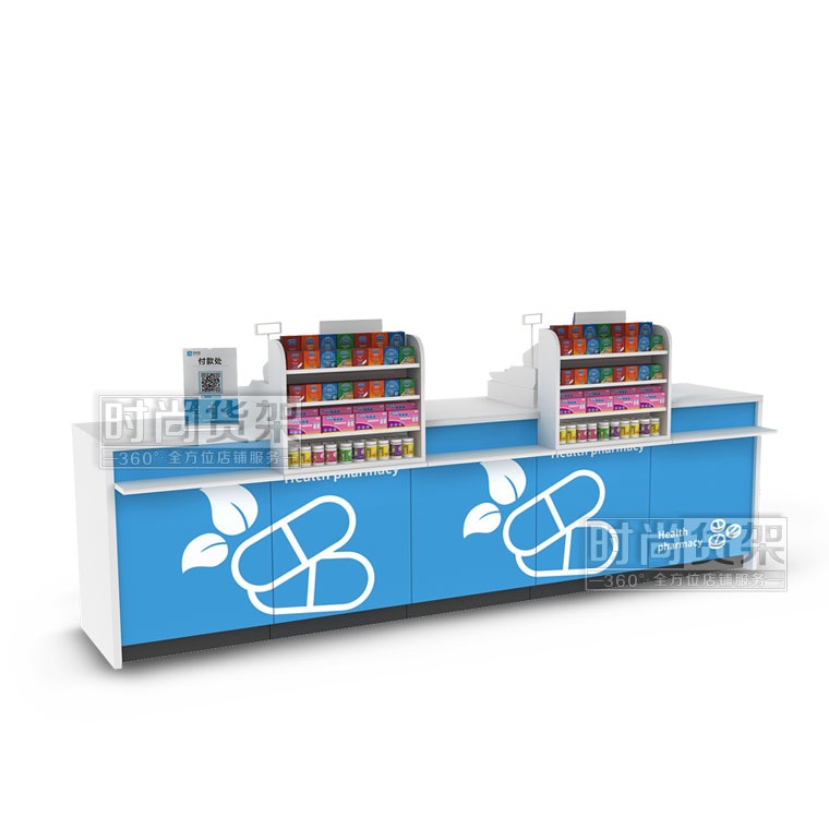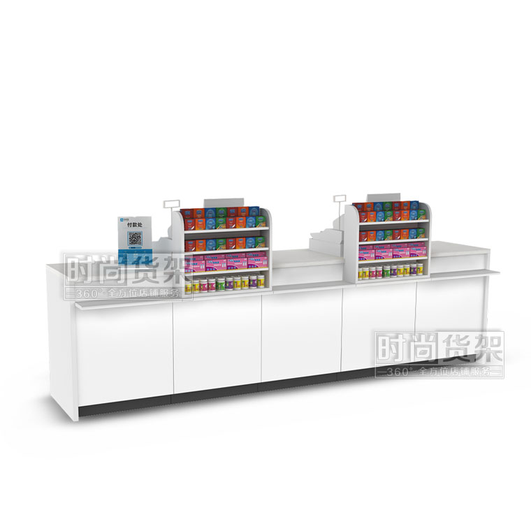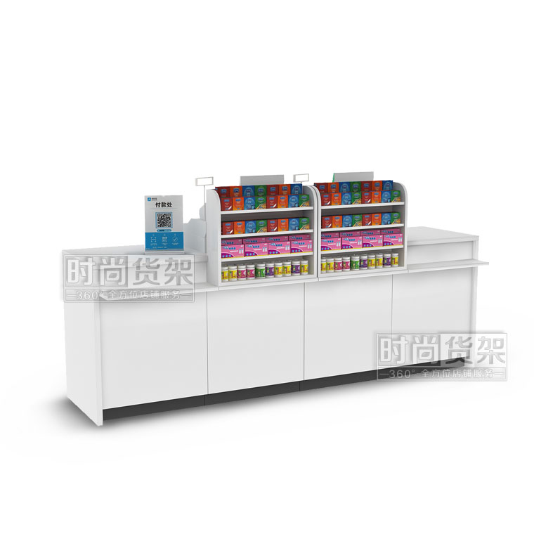 - 產(chǎn)品描述:這是時尚貨架最新推出的一款專用于藥店收銀區(qū)的多功能收銀臺。